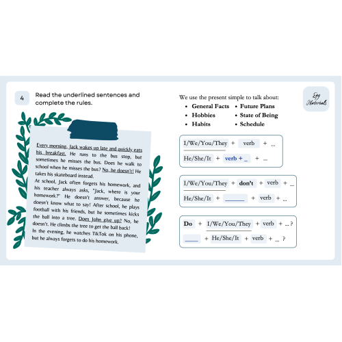 Grammar Rules: Students identify and complete the rules for the present simple tense.