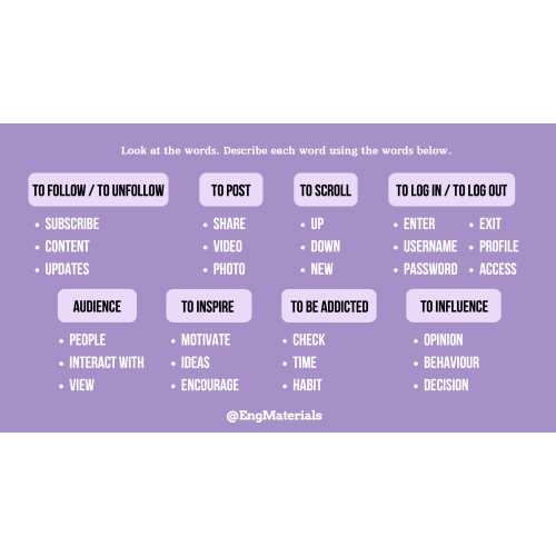 - Describing social media terms using provided words: This focuses on vocabulary acquisition and understanding through association.