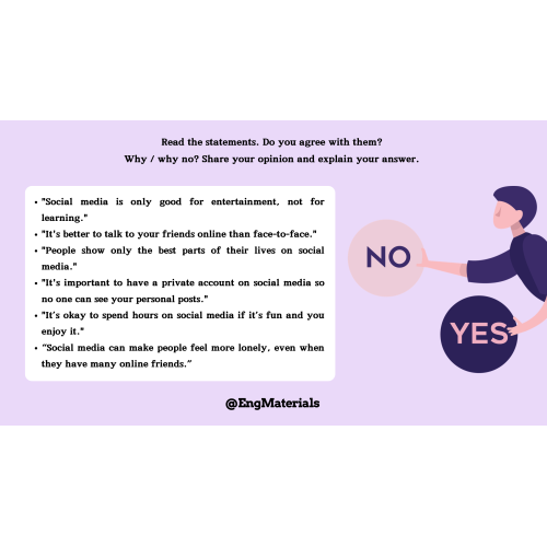 - Agreeing or disagreeing with statements about social media: This encourages critical thinking and the expression of opinions.