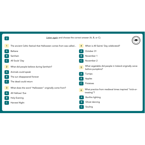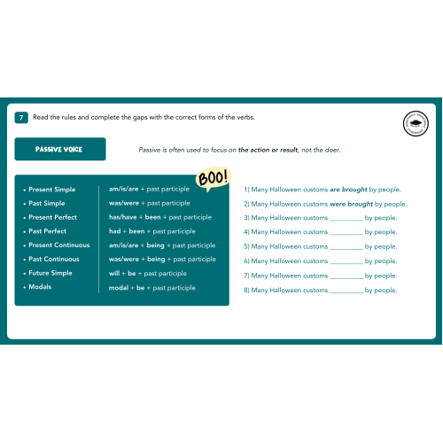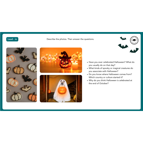 In this lesson, students explore the origins and traditions of Halloween while practicing the passive voice in context. The lesson begins with a lead-in discussion about Halloween traditions and associations, followed by a listening task that traces Halloween’s history from the Celtic festival of Samhain to modern celebrations in the U.S. Students complete comprehension activities, match ideas, and analyze how Halloween customs evolved. Grammar practice focuses on forming and using passive structures across different tenses. The lesson concludes with discussion and creative speaking tasks, encouraging students to use passive forms to describe Halloween traditions and express their own ideas about the holiday.