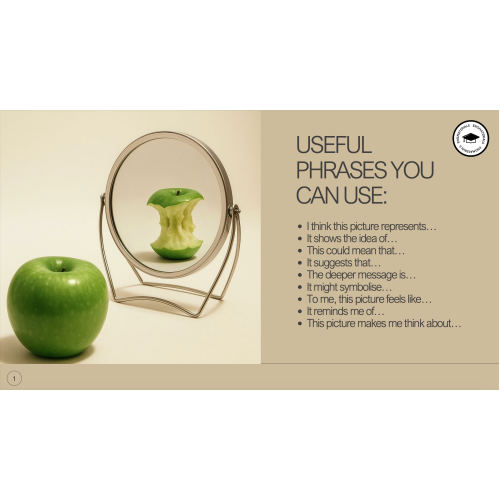 This reflective activity encourages students to think critically and creatively by interpreting images with deeper meaning. Students examine a series of thought-provoking pictures and explain what ideas, emotions, or messages they believe each image represents. The task builds visual literacy, develops descriptive language, and promotes meaningful discussion. It can be used as a warm-up, speaking activity, or writing prompt for A2–B2 learners.