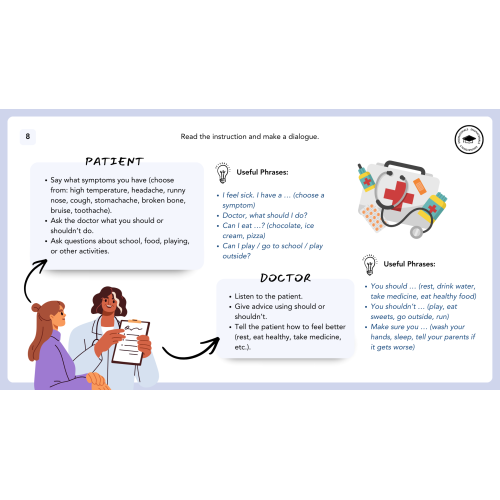 Role-play doctor–patient conversations using useful phrases and target language.