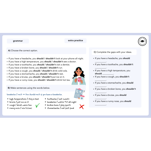 Identify and practice structures with should / shouldn’t for giving health advice.