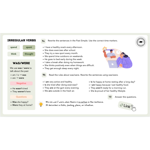This engaging A1–A2 lesson helps students talk about healthy habits while practising the Past Simple tense. Students explore everyday routines such as doing exercises, eating healthy food, getting enough sleep, and spending time outdoors through reading, speaking, and interactive tasks.