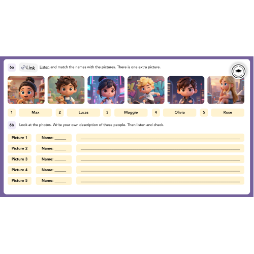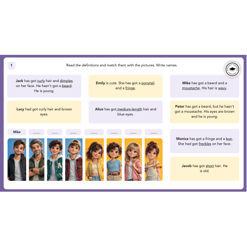 Students then move to communicative activities, including describing people, guessing games, and pair work, which develop speaking fluency and confidence. A variety of tasks encourage learners to use target language in meaningful contexts.