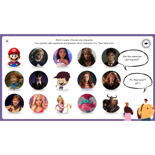 The lesson finishes with a writing task, where students describe a favourite character, integrating all vocabulary areas. Additional practice tasks can be used for homework or revision.