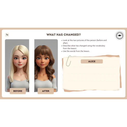 The lesson finishes with interactive speaking and comparison tasks, where students describe changes in appearance and personalise the topic. Extra activities can be used for revision or homework.