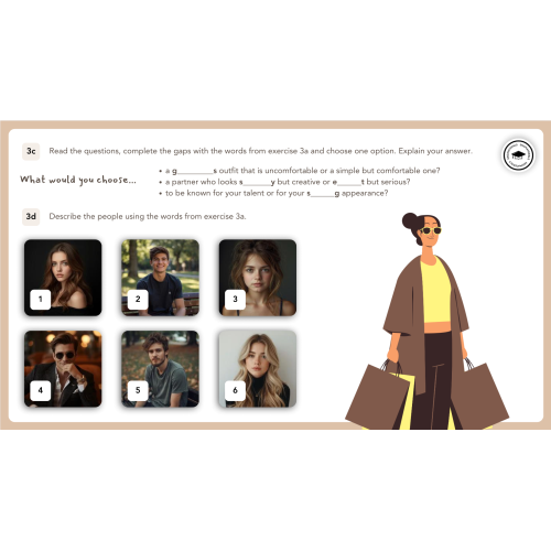 This lesson introduces and practises vocabulary for describing appearance, including facial features, hair, and overall style. Students begin with a personalised lead-in, discussing opinions about appearance and its impact on life.