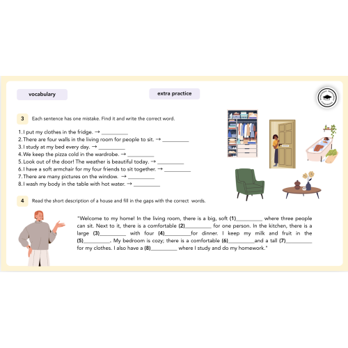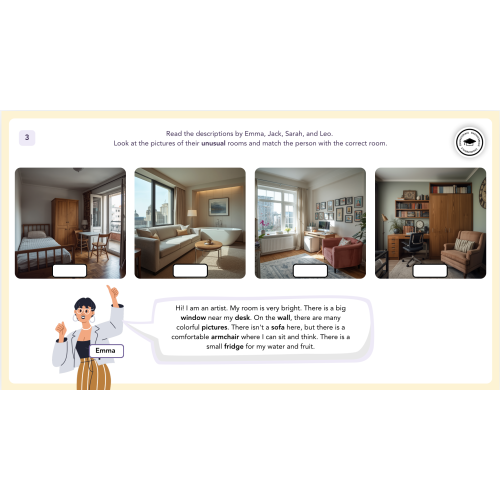 This lesson introduces and practises essential vocabulary related to the home and everyday objects, such as furniture and rooms, while also developing learners’ ability to describe spaces. Students begin with an engaging lead-in activity, guessing objects from simple descriptions and identifying items in visual tasks.
