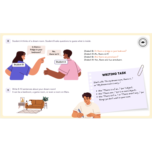 The lesson continues with guided vocabulary presentation and practice, followed by reading and listening activities that expose learners to descriptions of different rooms and lifestyles. Grammar is introduced through the structure there is / there are, with clear explanations and controlled practice tasks to build accuracy.