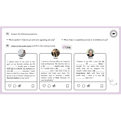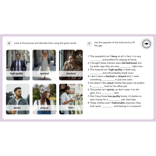 This A2-level lesson “Dress to Impress” focuses on building essential vocabulary related to clothing, materials, patterns, and style. It begins with an engaging lead-in where students reflect on their fashion habits and personal style, followed by a reading task that introduces key language in context.