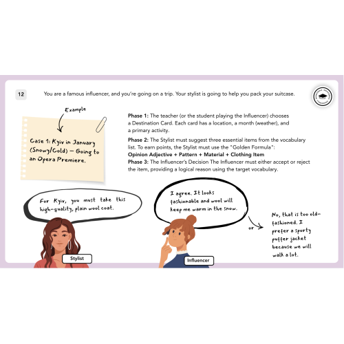 Communicative speaking activities encourage students to express opinions about clothes, compare styles, and make practical decisions using the target language. A creative role-play task (“Stylist & Influencer”) adds a fun, real-life element and promotes fluency.