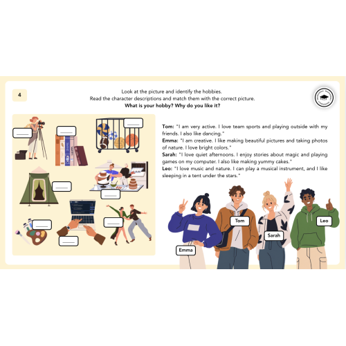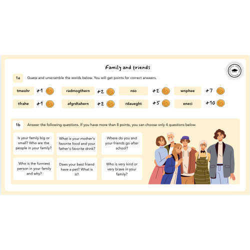 This lively A1–A2 revision lesson explores essential everyday topics and foundational vocabulary through the themes of family, school, and community. Students are introduced to common words and phrases which naturally lead into discussions about their routines, hobbies, and personal interests.